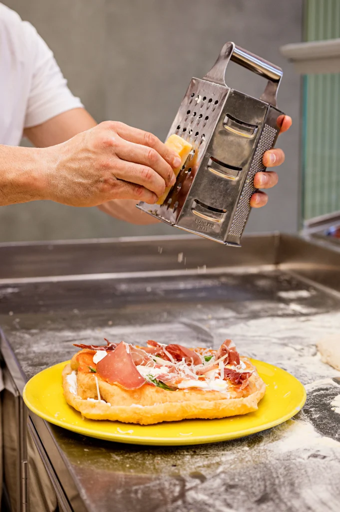 Per realizzare ‘O Scugniziello, utilizziamo solo ingredienti di qualità superiore: farcita con ricotta di bufala cremosa e condita con pomodoro fresco, prosciutto crudo stagionato 24 mesi, mozzarella di bufala DOP, basilico e olio extravergine di oliva. Ogni ingrediente è scelto con cura per dare vita a un equilibrio di sapori che racchiude tutta l’autenticità della cucina partenopea. Ogni morso è una sinfonia di sapori che si incontrano, si completano e sorprendono, come in un gioco di ragazzi.